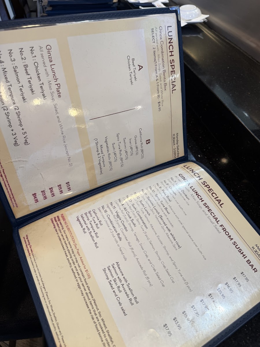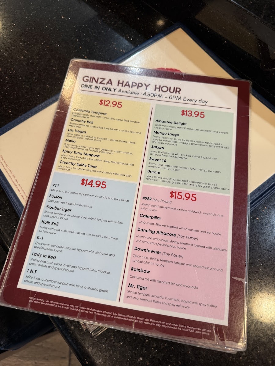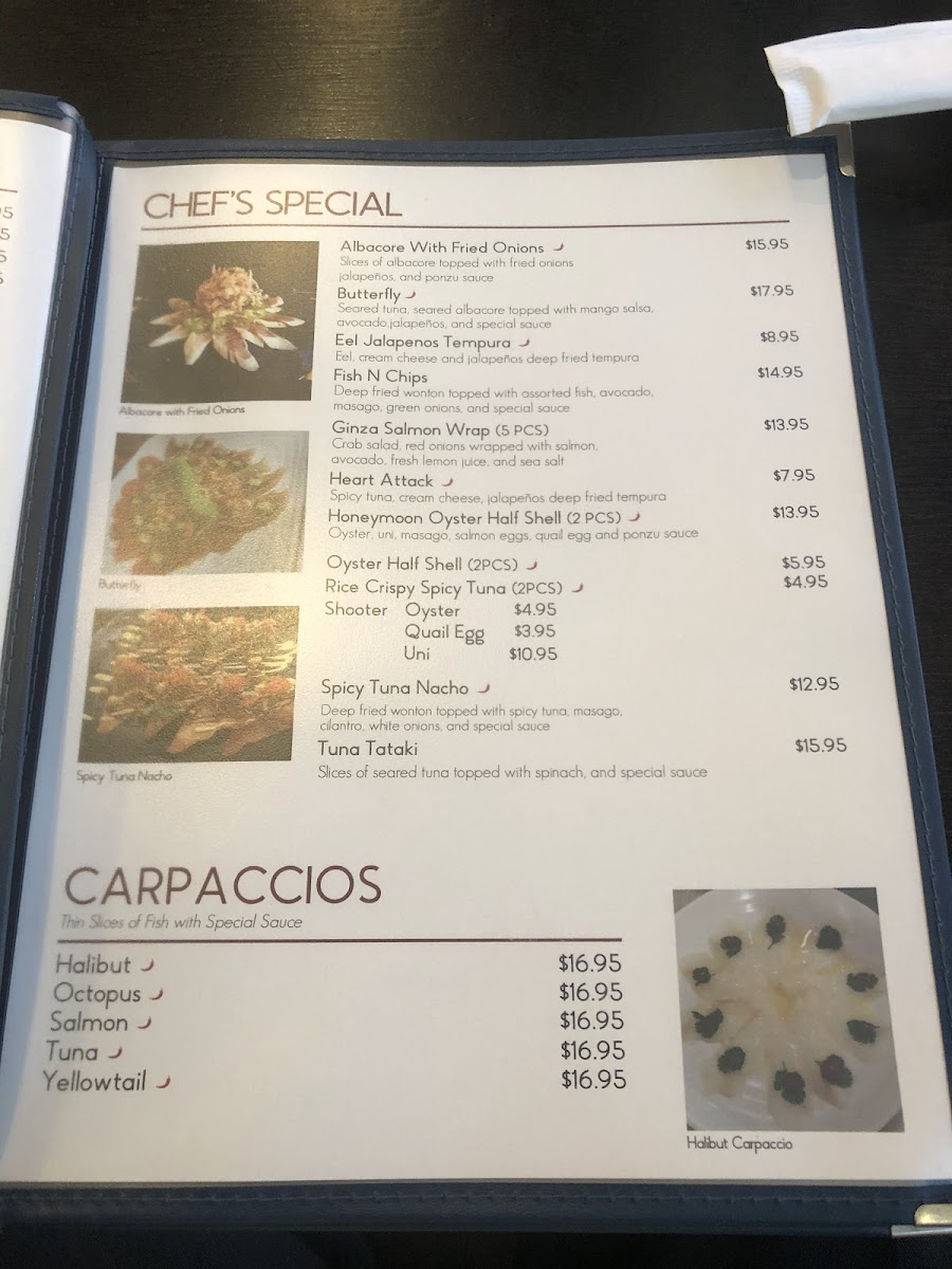 Welcome to Ginza Sushi, a hidden gem located at 1068 E Bastanchury Rd, Fullerton, CA. This delightful restaurant offers an exquisite menu that beautifully blends tradition and innovation. Start your culinary journey with their enticing carpaccios, available in spicy yellowtail, halibut, salmon, and tuna, each priced at $19.95.